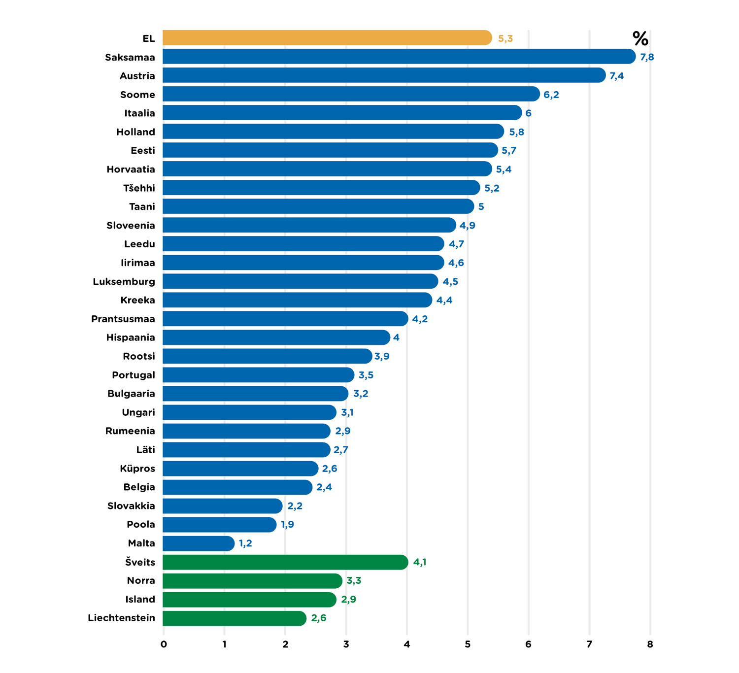 Joonis 3. Tehnoloogilised trendid, mis mõjutavad majanduskeskkonda 2025-2030 (% küsitletud firmadest, kes peavad nimetatud tehnoloogiatrendi tõenäoliseks ettevõtte muutust juhtivaks teguriks)