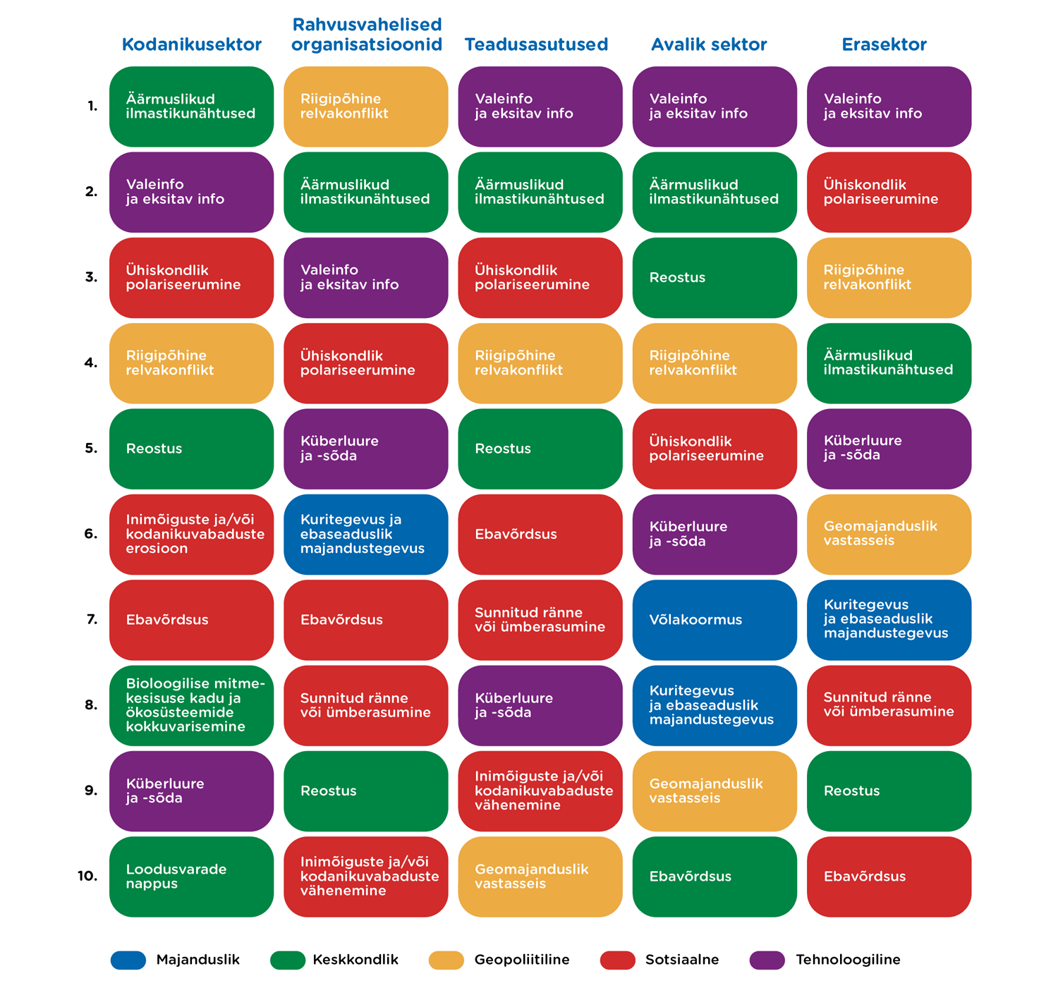 2. Poliitika ja valitsemine. Efektiivne poliitika peab arvestama üleilmseid riske, nagu kliimamuutused, loodusõnnetused ja elurikkuse kadu. Globaalse koostöö saavutamine muutub keerulisemaks, kuna võtmerollis olevad riigid näevad üksteist üha enam rivaalide, mitte partneritena. Autokraatlikud tendentsid kasvavad ka demokraatiates endis. Lühemas vaates mõjutavad poliitilist stabiilsust majanduslikud ja geopoliitilised riskid, kuid pikemas vaates tõusevad esikohale kliima- ja loodusprobleemid. Liberaalsete demokraatiate arv on viimase kümnendi jooksul vähenenud, autokraatlike riikide arv kasvanud, samas kui rahulolematus valitsemisvormidega on osas riikides tõusnud.